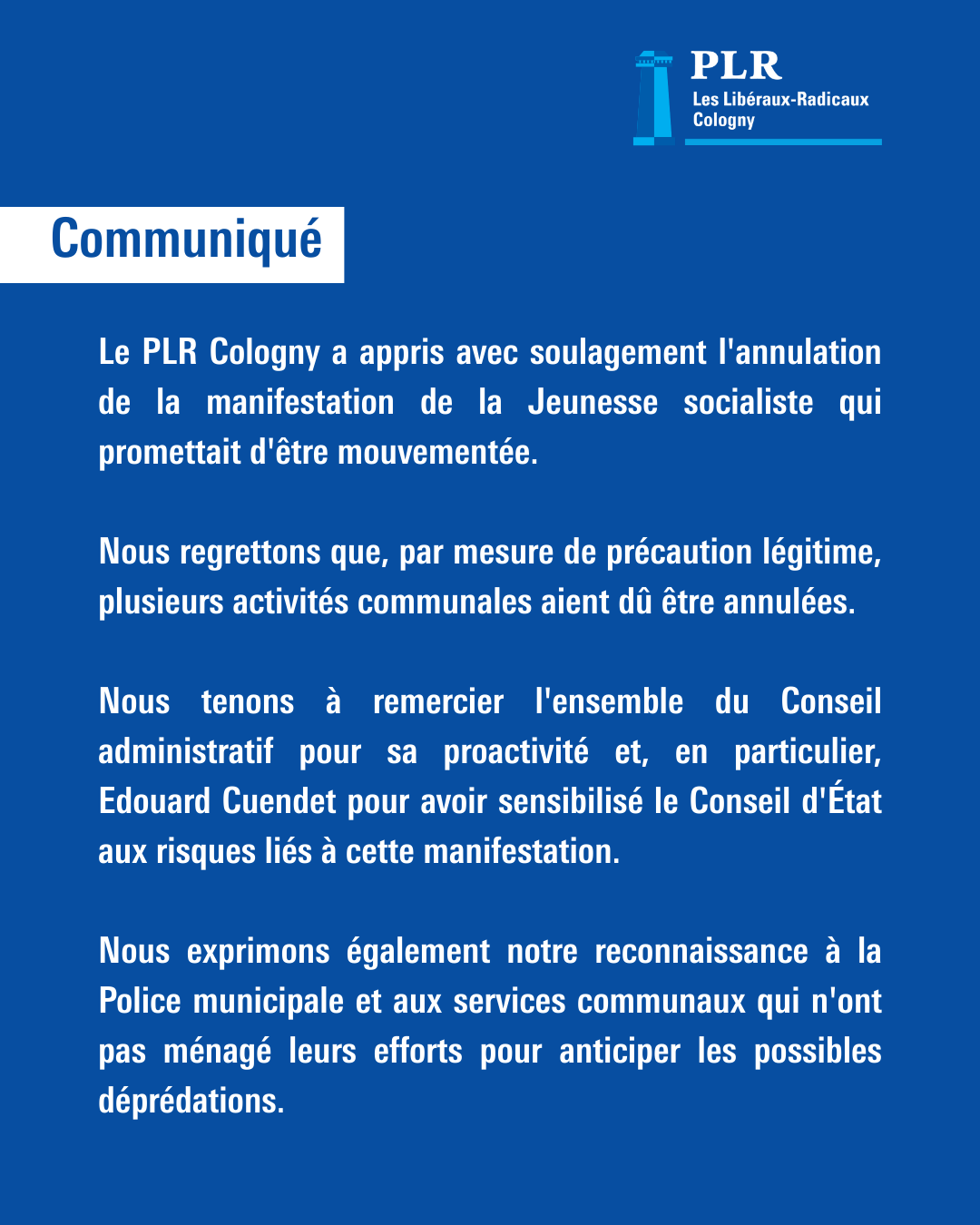 Comme mentionné dans notre communiqué, le PLR Cologny est soulagé que le bon sens ait fini parprévaloir et remercie le Conseil administratif, ainsi que Nathalie Fontanet pour leurs interventions.