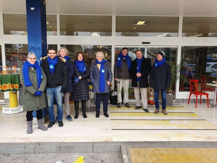 Une belle équipe PLR, parmi les candidat(e)s aux prochaines élections de Chêne-Bougeries, à la rencontre des clients du centre commercial du Chemin De-La-Montagne.