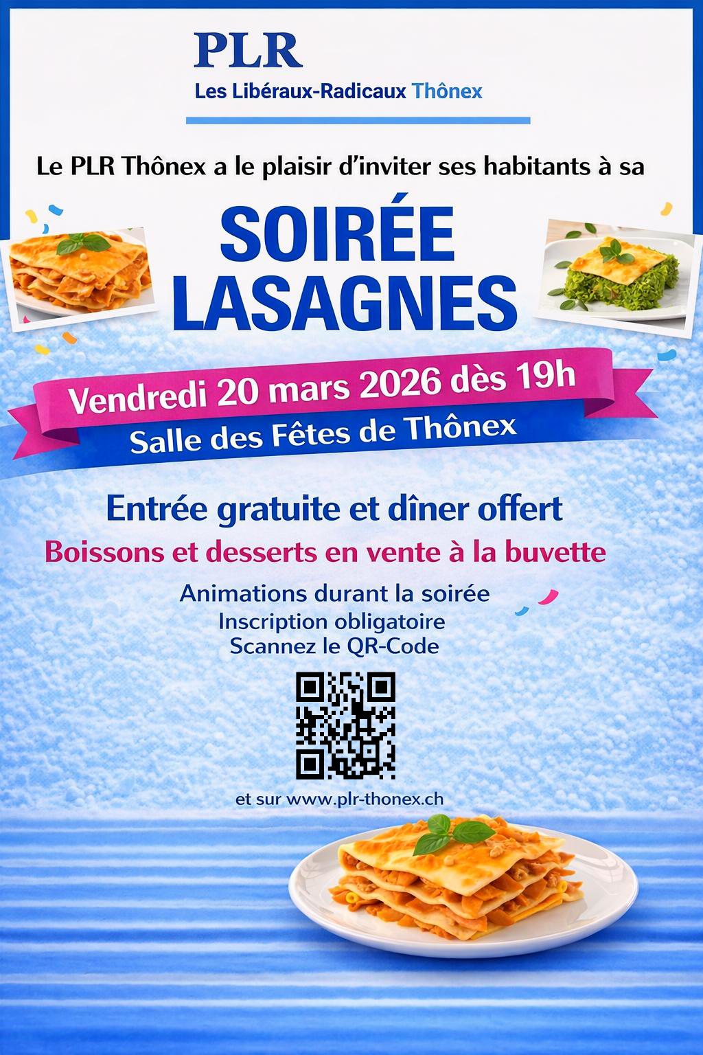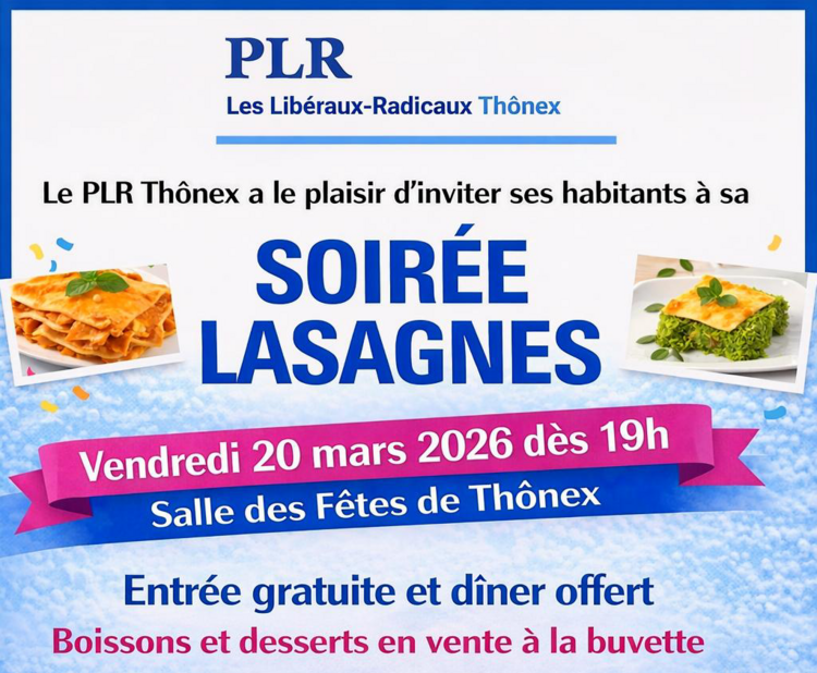 D’année en année, la Soirée Lasagnes s’est imposée comme un moment simple et chaleureux où l’on se retrouve entre habitants, autour d’un bon repas et d’échanges sans formalisme. Le PLR Thônex est heureux d’offrir le repas à toutes et tous. L’entrée est libre et le dîner est pris en charge. Boissons et desserts seront proposés à la buvette à prix accessibles. Et bien sûr, une animation viendra ponctuer la soirée pour garantir une ambiance festive et détendue.